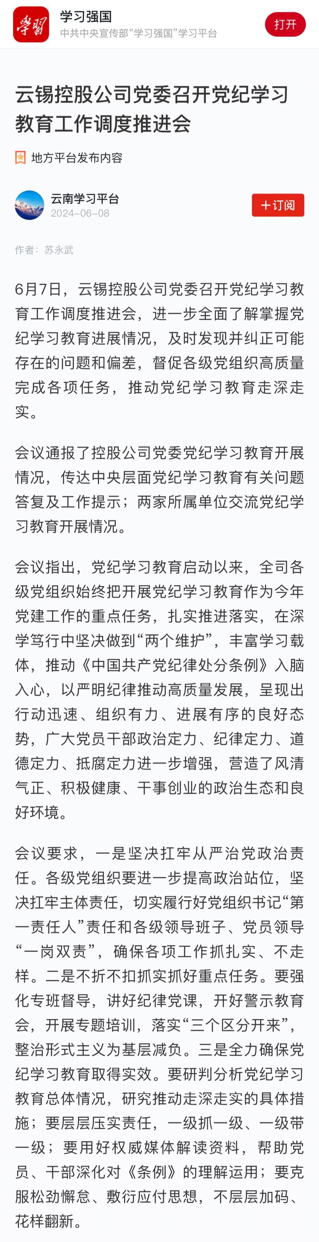 學習強國:云錫控股公司黨委召開黨紀學習教育工作調(diào)度推進會