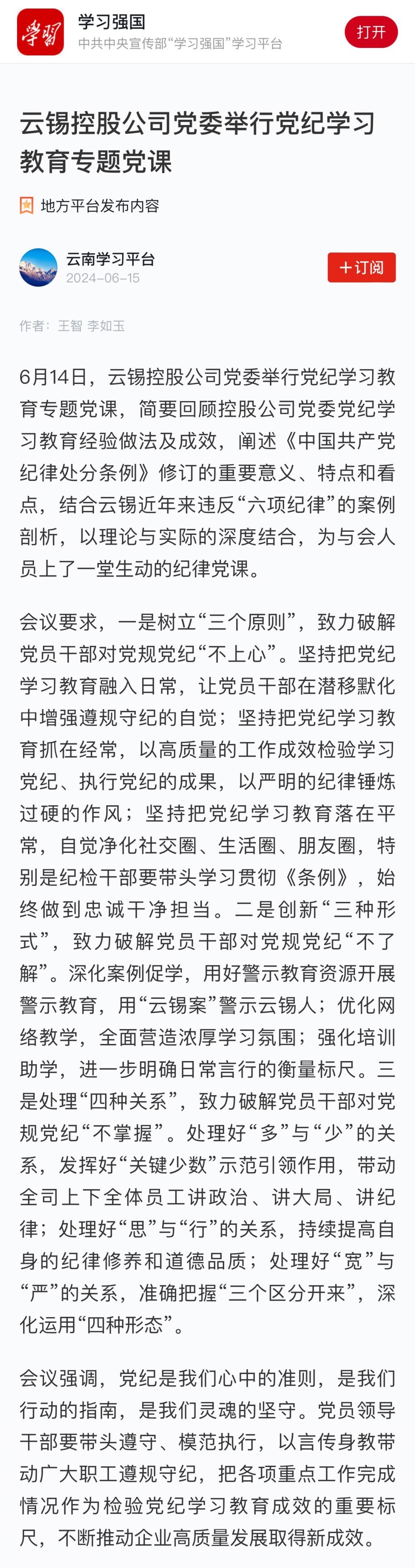 學(xué)習(xí)強國:云錫控股公司黨委舉行黨紀(jì)學(xué)習(xí)教育專題黨課