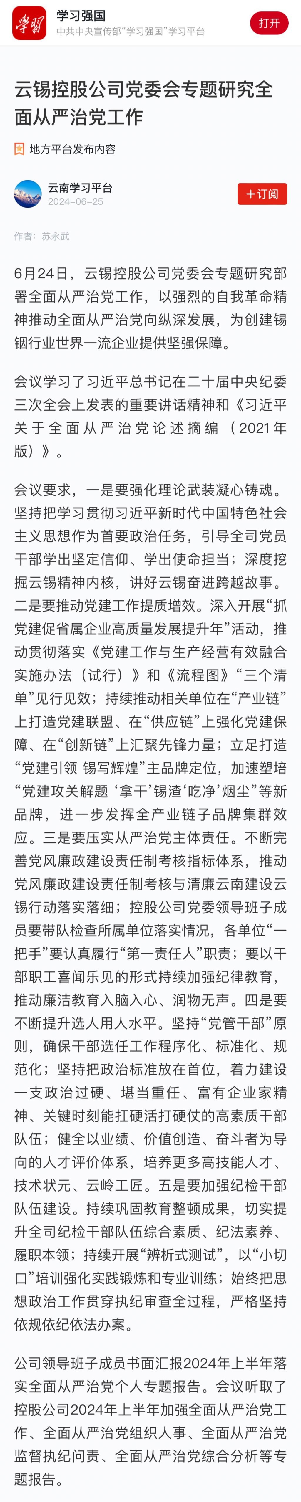 學(xué)習(xí)強(qiáng)國:云錫控股公司黨委會專題研究全面從嚴(yán)治黨工作
