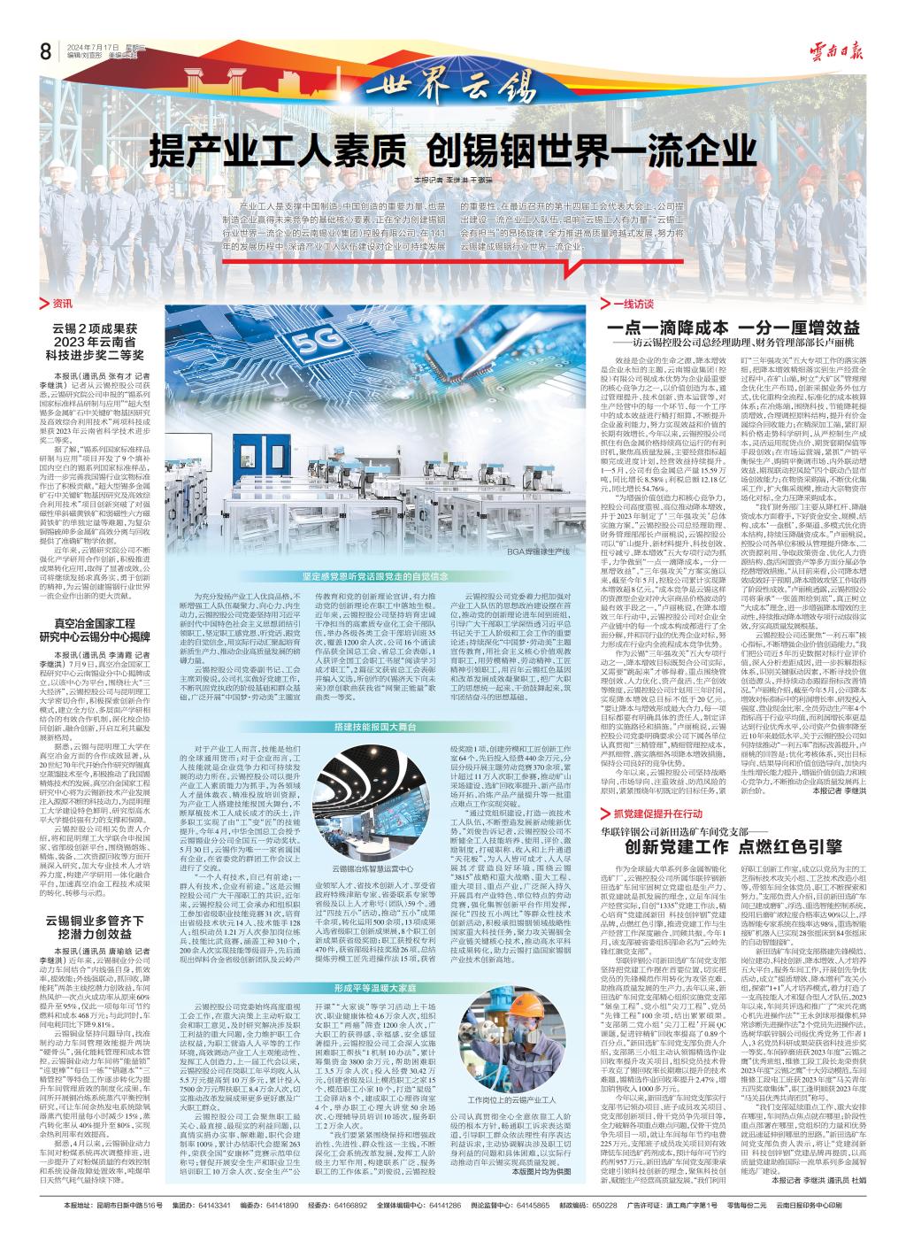 “通過黨組織建設(shè),打造一流技術(shù)工人隊伍,不斷塑造發(fā)展新動能新優(yōu)勢。”劉俊告訴記者,云錫控股公司不斷健全工人技能培養(yǎng)、使用、評價、激勵制度,打破職稱、收入和上升通道“天花板”,為人人皆可成才、人人盡展其才營造良好環(huán)境。圍繞云錫“3815”戰(zhàn)略和重大戰(zhàn)略、重大工程、重大項目、重點產(chǎn)業(yè),廣泛深入持久開展具有產(chǎn)業(yè)特色、單位特點的勞動競賽,強(qiáng)化集智創(chuàng)新平臺作用發(fā)揮,深化“四技五小兩比”等群眾性技術(shù)創(chuàng)新活動,積極承擔(dān)錫銦領(lǐng)域戰(zhàn)略性國家重大科技任務(wù),聚力攻關(guān)錫銦全產(chǎn)業(yè)鏈關(guān)鍵核心技術(shù),推動高水平科技成果轉(zhuǎn)化,助力云錫打造國家錫銦產(chǎn)業(yè)技術(shù)創(chuàng)新高地。