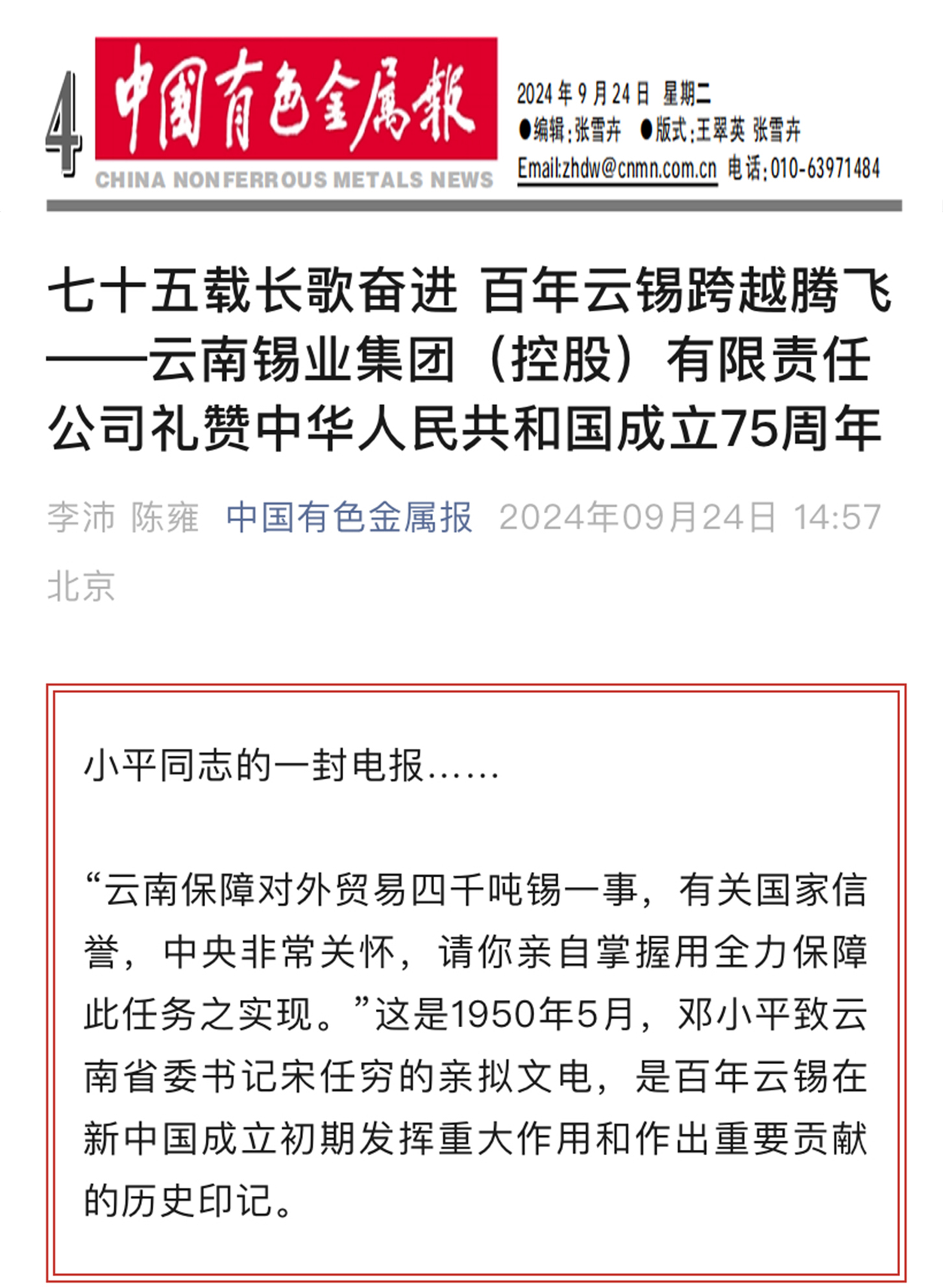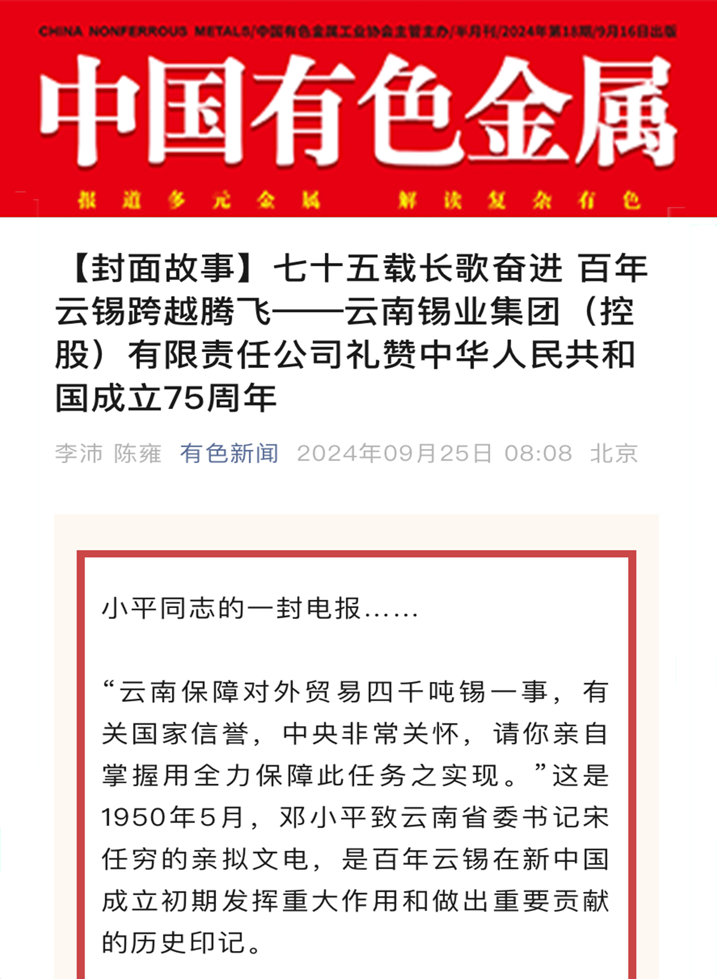 近日,中國(guó)有色金屬雜志封面故事、中國(guó)有色金屬報(bào)專(zhuān)版刊發(fā)《七十五載長(zhǎng)歌奮進(jìn) 百年云錫跨越騰飛——云南錫業(yè)集團(tuán)(控股)有限責(zé)任公司禮贊中華人民共和國(guó)成立75周年》,全面展現(xiàn)百年云錫跨越騰飛的壯美畫(huà)卷。
