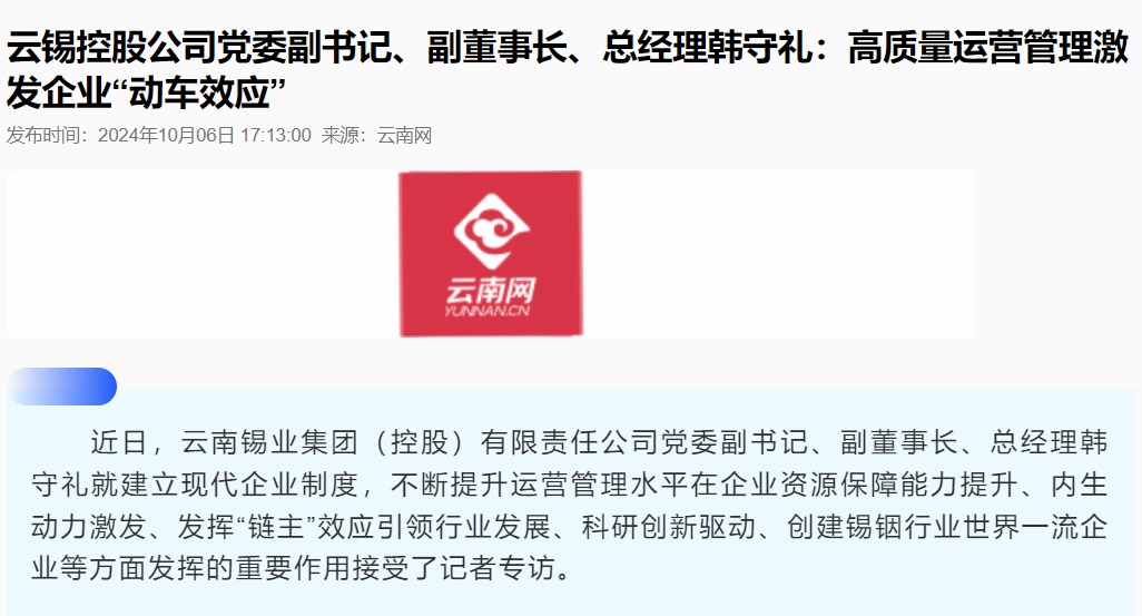 近日,云南錫業(yè)集團(控股)有限責(zé)任公司黨委副書記、副董事長、總經(jīng)理韓守禮就建立現(xiàn)代企業(yè)制度,不斷提升運營管理水平在企業(yè)資源保障能力提升、內(nèi)生動力激發(fā)、發(fā)揮“鏈主”效應(yīng)引領(lǐng)行業(yè)發(fā)展、科研創(chuàng)新驅(qū)動、創(chuàng)建錫銦行業(yè)世界一流企業(yè)等方面發(fā)揮的重要作用接受了記者專訪。