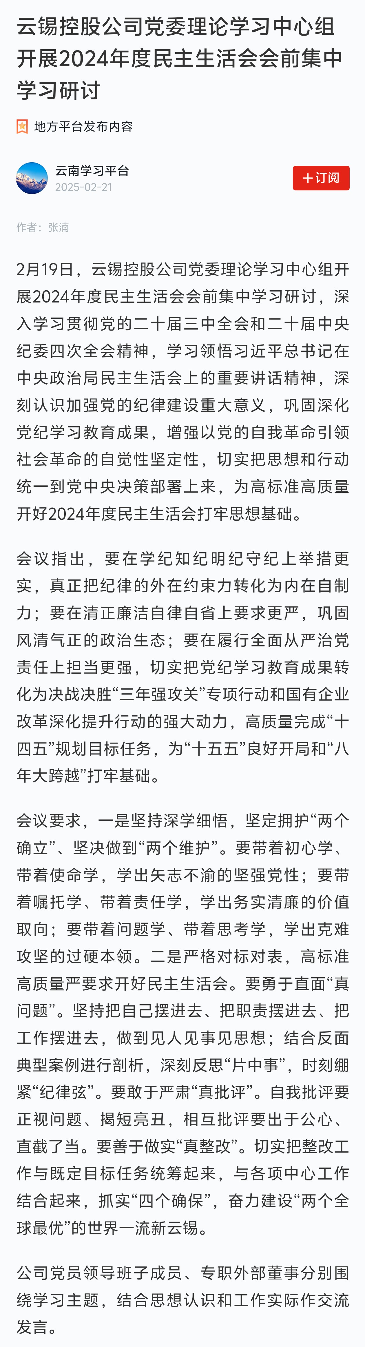 學(xué)習(xí)強(qiáng)國:云錫控股公司黨委理論學(xué)習(xí)中心組開展2024年度民主生活會會前集中學(xué)習(xí)研討