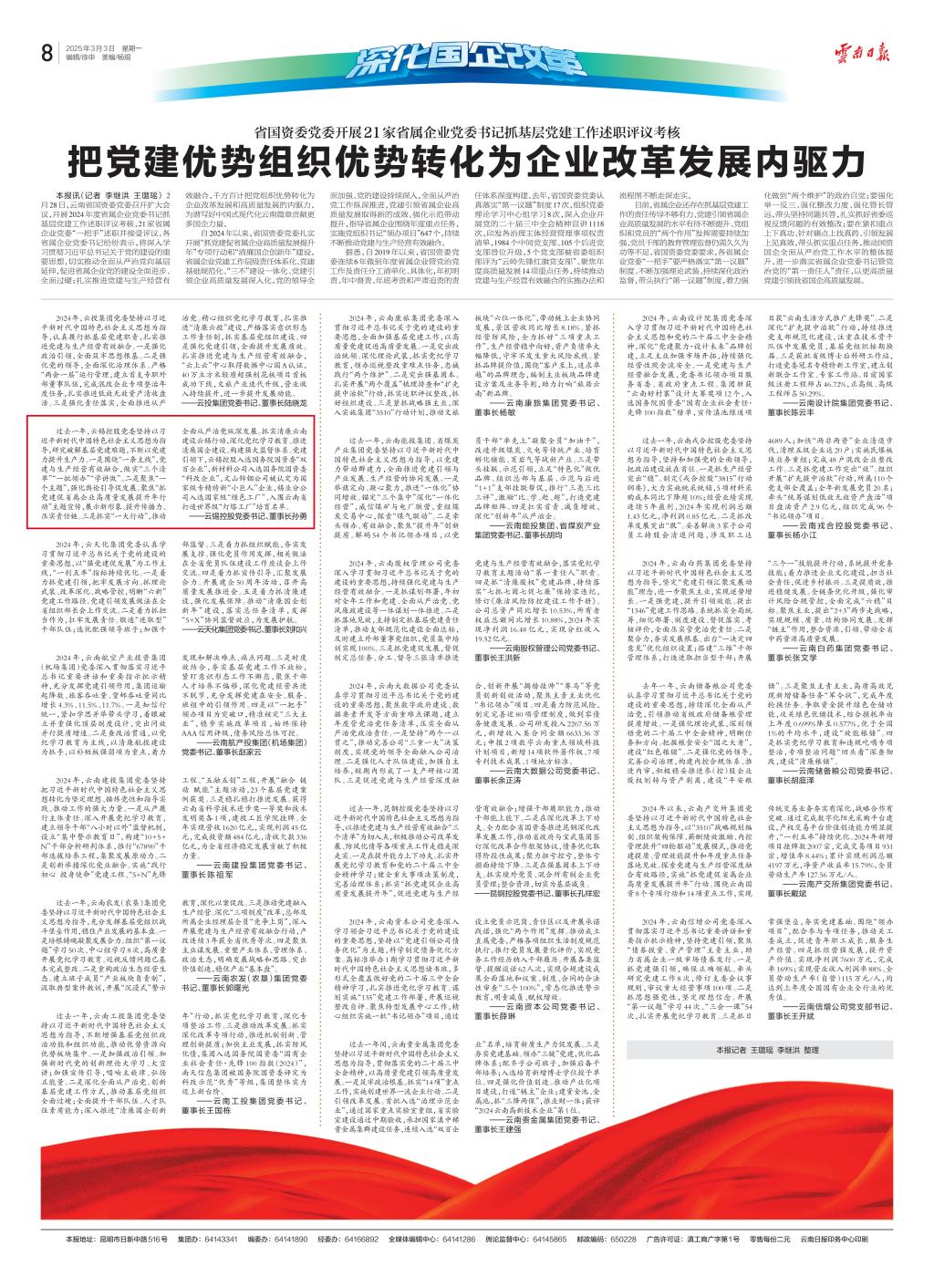 本報(bào)訊(記者 李繼洪 王璐瑤) 2月28日,云南省國(guó)資委黨委召開擴(kuò)大會(huì)議,開展2024年度省屬企業(yè)黨委書記抓基層黨建工作述職評(píng)議考核,21家省屬企業(yè)黨委“一把手”述職并接受評(píng)議。各省屬企業(yè)黨委書記紛紛表示,將深入學(xué)習(xí)貫徹習(xí)近平總書記關(guān)于黨的建設(shè)的重要思想,切實(shí)推動(dòng)全面從嚴(yán)治黨向基層延伸,促進(jìn)省屬企業(yè)黨的建設(shè)全面進(jìn)步、全面過(guò)硬;扎實(shí)推進(jìn)黨建與生產(chǎn)經(jīng)營(yíng)有效融合,千方百計(jì)把黨組織優(yōu)勢(shì)轉(zhuǎn)化為企業(yè)改革發(fā)展和高質(zhì)量發(fā)展的內(nèi)驅(qū)力,為譜寫好中國(guó)式現(xiàn)代化云南篇章貢獻(xiàn)更多國(guó)企力量。