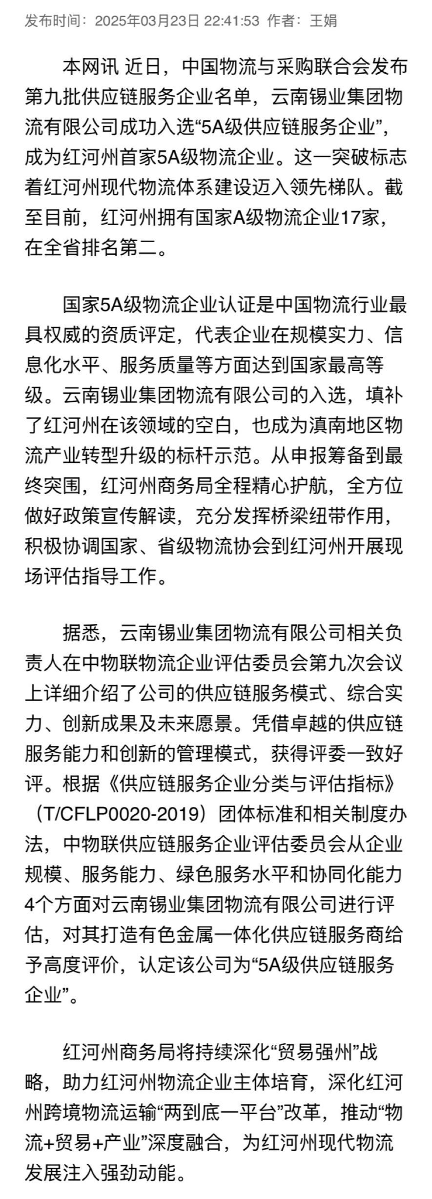 紅河網(wǎng):紅河州首家5A級物流企業(yè)申報成功