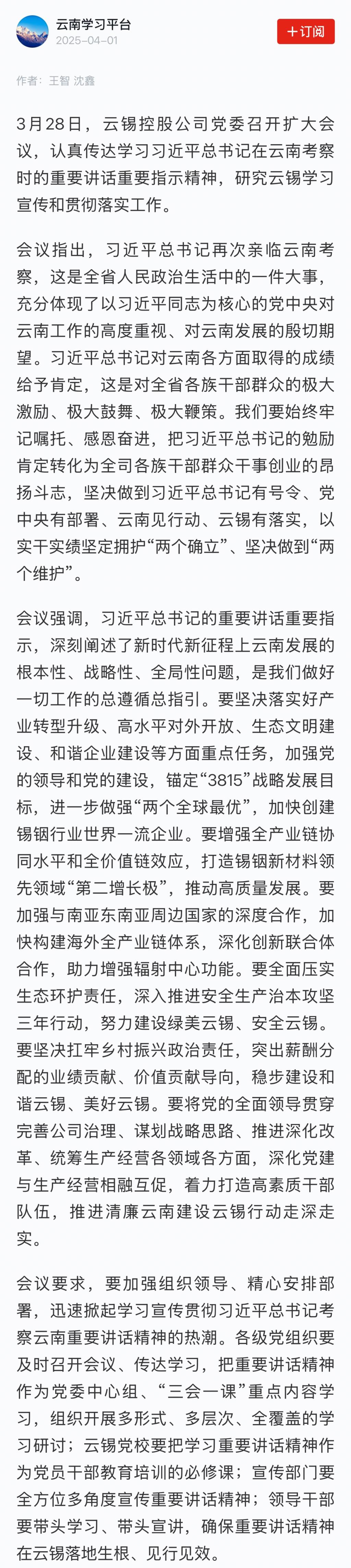 學(xué)習(xí)強(qiáng)國:云錫控股公司黨委召開擴(kuò)大會(huì)議 認(rèn)真?zhèn)鬟_(dá)學(xué)習(xí)習(xí)近平總書記考察云南重要講話重要指示精神