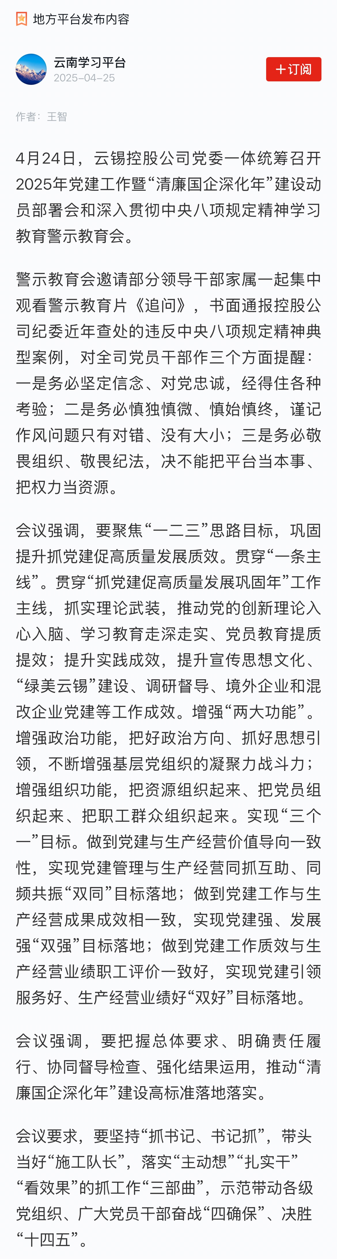 學(xué)習(xí)強國:云錫控股公司黨委召開2025年黨建工作暨“清廉國企深化年”建設(shè)動員部署、警示教育會