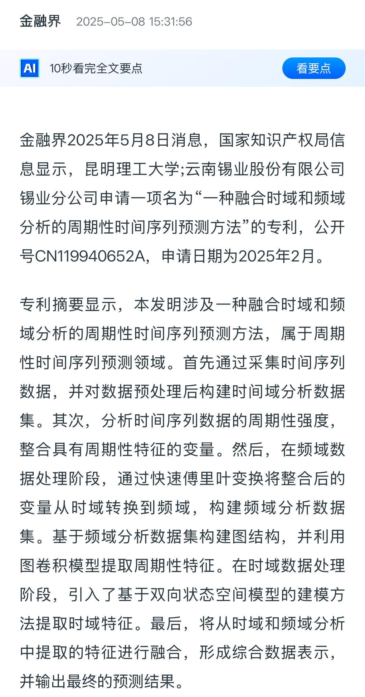 金融界:昆明理工大學(xué)和云南錫業(yè)股份有限公司錫業(yè)分公司申請融合時域和頻域分析的周期性時間序列預(yù)測專利,能實現(xiàn)時間序列的準(zhǔn)確預(yù)測
