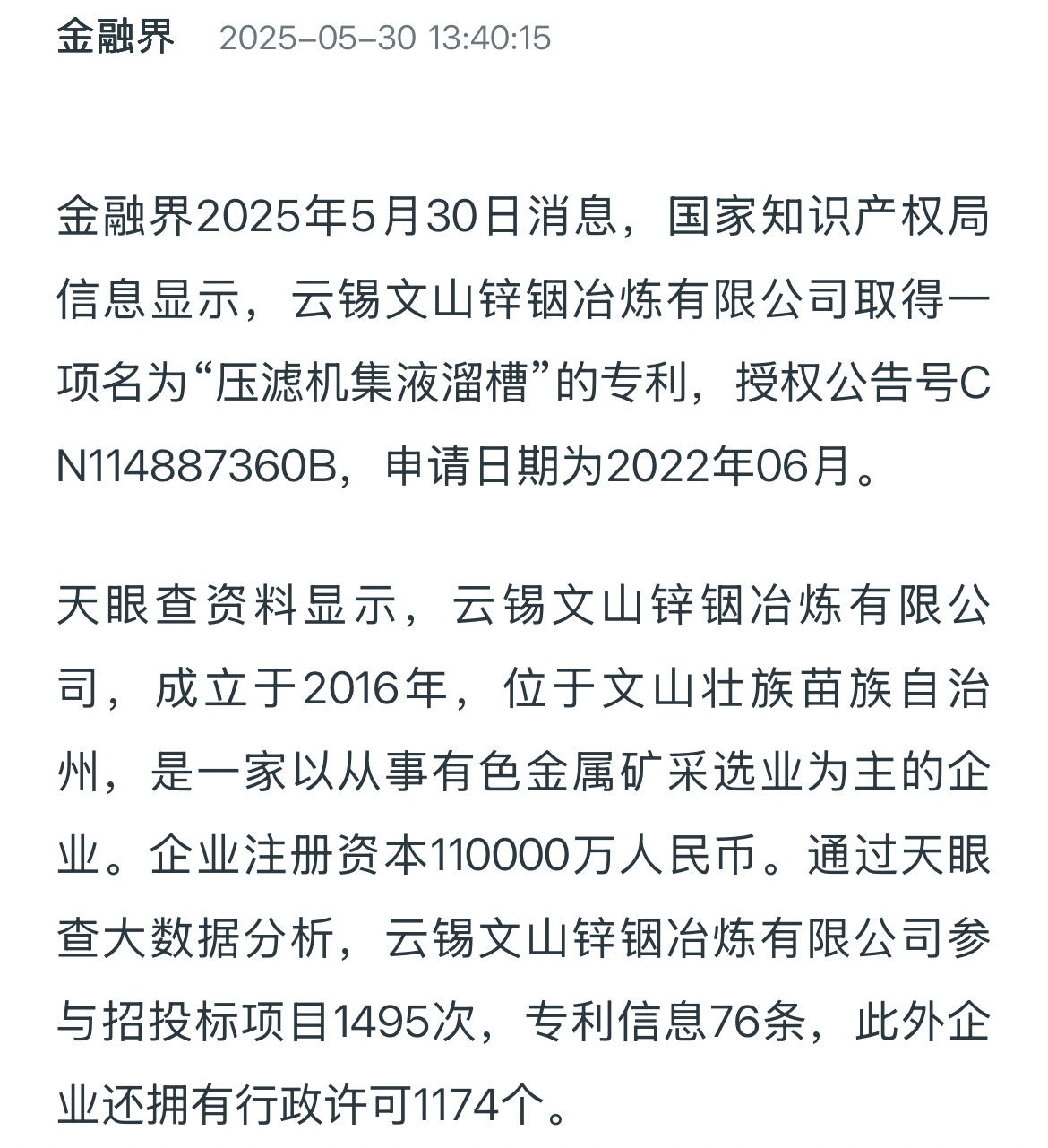 金融界:云錫文山鋅銦冶煉取得壓濾機(jī)集液溜槽專利