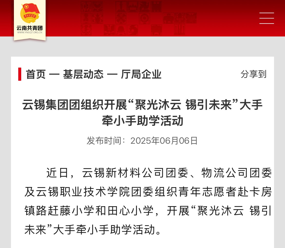 云南共青團:云錫集團團組織開展“聚光沐云 錫引未來”大手牽小手助學活動