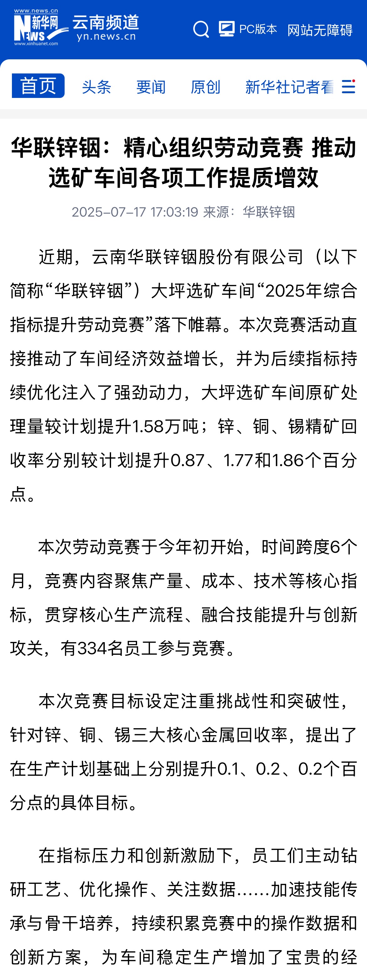 新華網(wǎng):華聯(lián)鋅銦精心組織勞動競賽 推動選礦車間各項工作提質增效