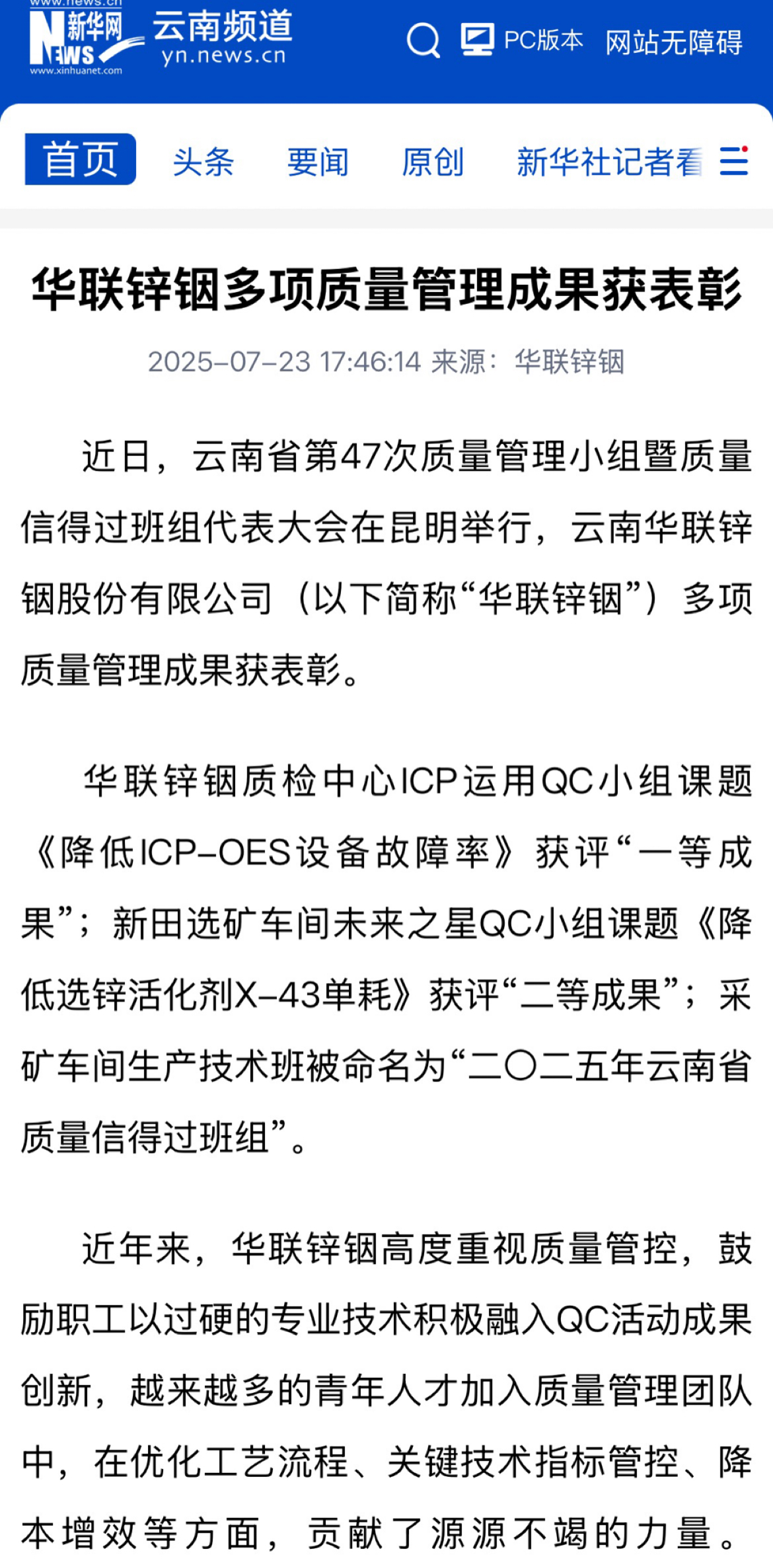 新華網(wǎng):華聯(lián)鋅銦多項質(zhì)量管理成果獲表彰