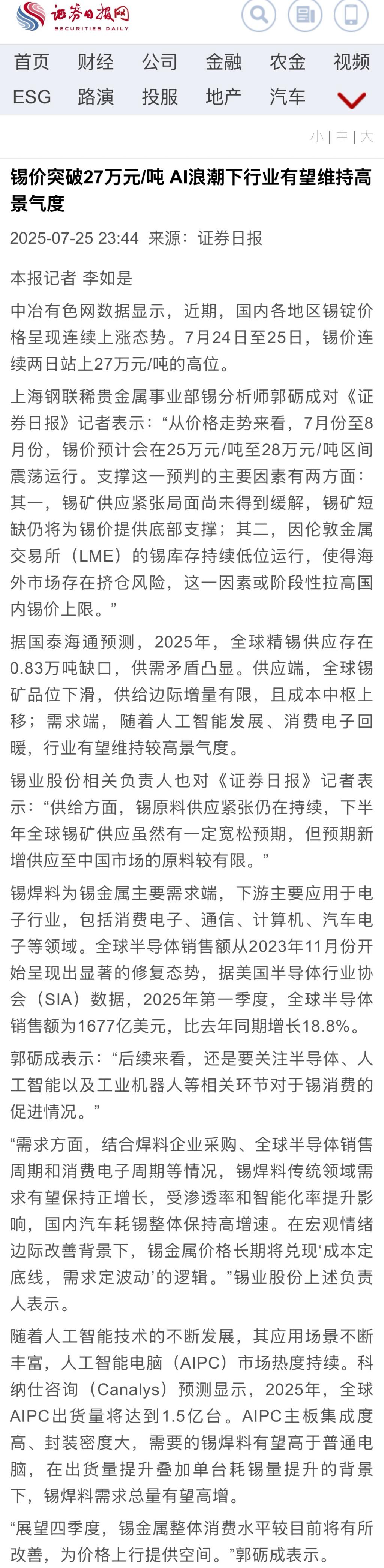 證券日報:錫價突破27萬元/噸 AI浪潮下行業(yè)有望維持高景氣度