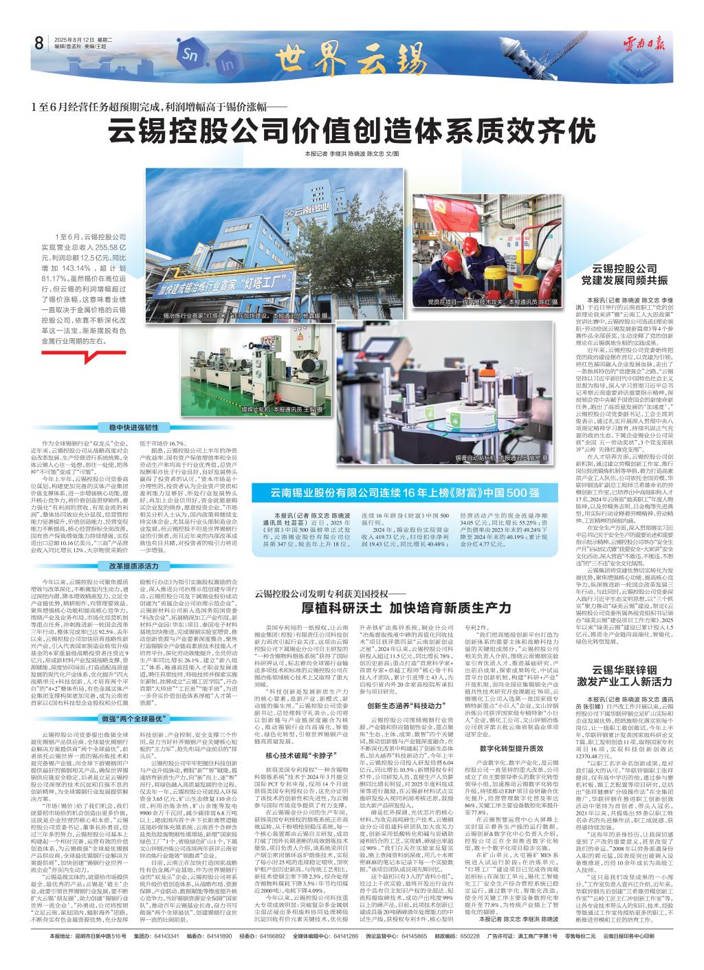 近日,2025年《財富》中國500強榜單正式發(fā)布,云南錫業(yè)股份有限公司位居第347位,較去年上升18位,連續(xù)16年躋身《財富》中國500強行列。