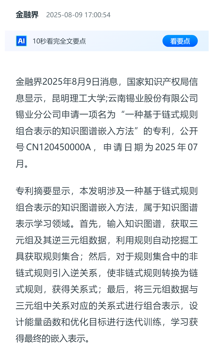 金融界:昆明理工大學(xué)等申請一種基于鏈?zhǔn)揭?guī)則組合表示的知識圖譜嵌入方法專利,提高知識圖譜嵌入表示能力