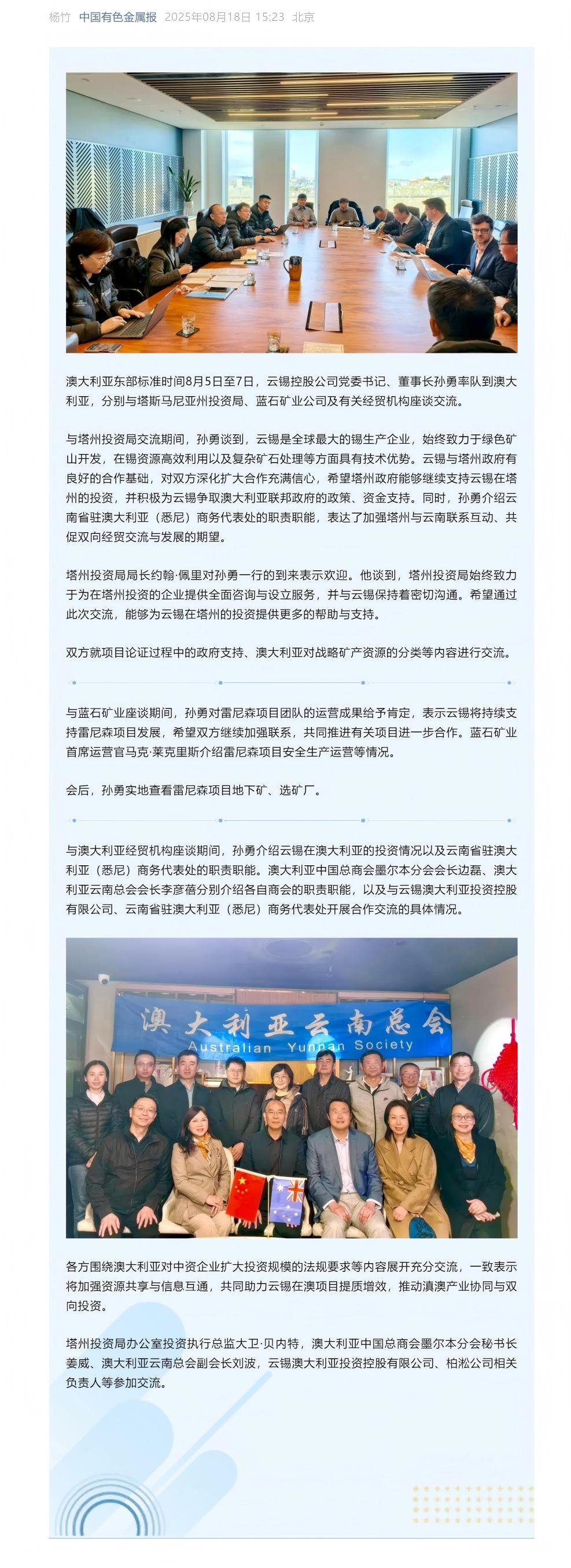 中國(guó)有色金屬報(bào):云錫控股公司黨委書記、董事長(zhǎng)孫勇率隊(duì)與澳大利亞塔斯馬尼亞州投資局、藍(lán)石礦業(yè)、經(jīng)貿(mào)機(jī)構(gòu)座談交流