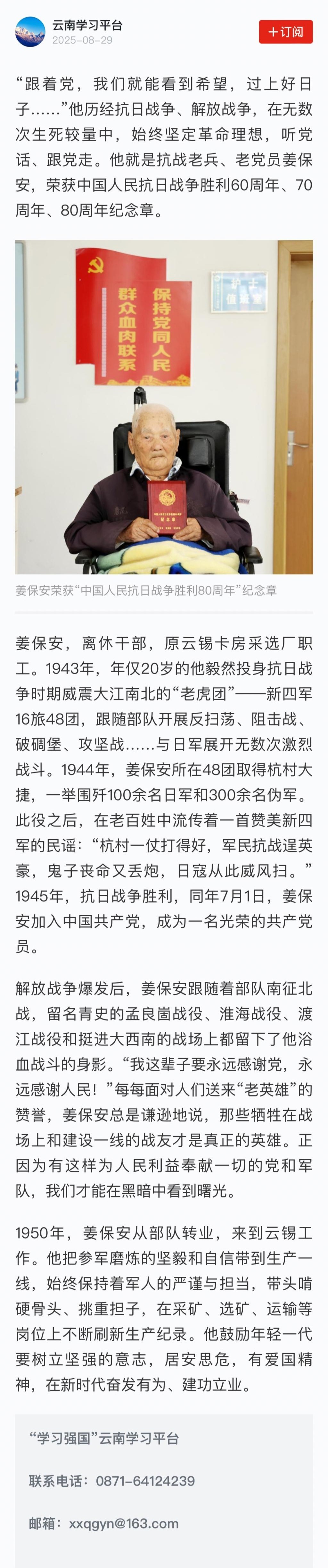 學(xué)習(xí)強(qiáng)國:姜保安——從新四軍“老虎團(tuán)”戰(zhàn)士到云錫奮斗者