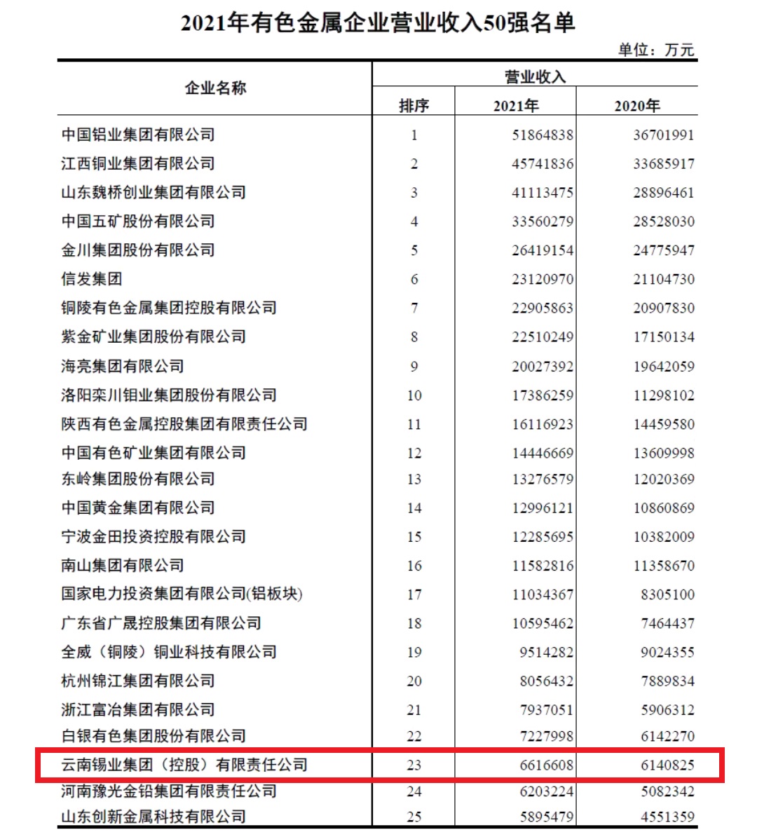 近日,中國有色金屬工業(yè)協(xié)會召開新聞發(fā)布會,發(fā)布2021年有色金屬企業(yè)營業(yè)收入50強名單,控股公司以營收661.66億元的業(yè)績,排名第23位。