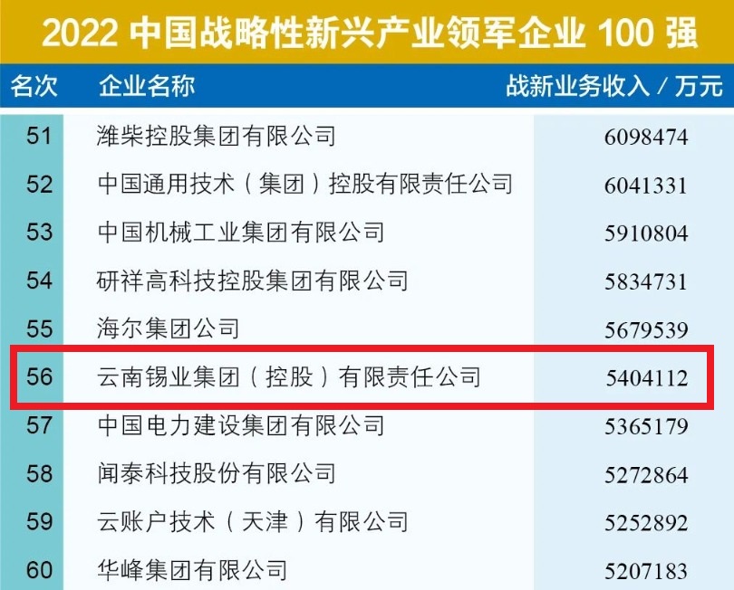 9月6日,中國(guó)企業(yè)聯(lián)合會(huì)、中國(guó)企業(yè)家協(xié)會(huì)(簡(jiǎn)稱中國(guó)企聯(lián))在京舉辦新聞發(fā)布會(huì),發(fā)布了“中國(guó)戰(zhàn)略新興產(chǎn)業(yè)領(lǐng)軍企業(yè)100強(qiáng)”榜單。云錫控股公司以戰(zhàn)新業(yè)務(wù)收入540.41億元的業(yè)績(jī),排名第56位。