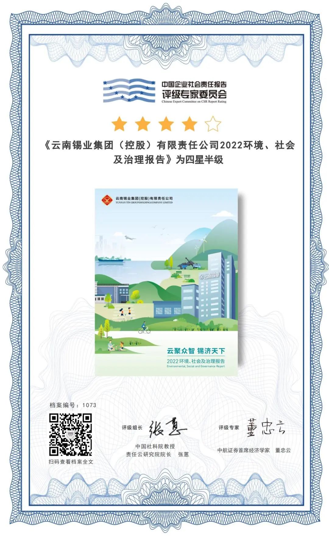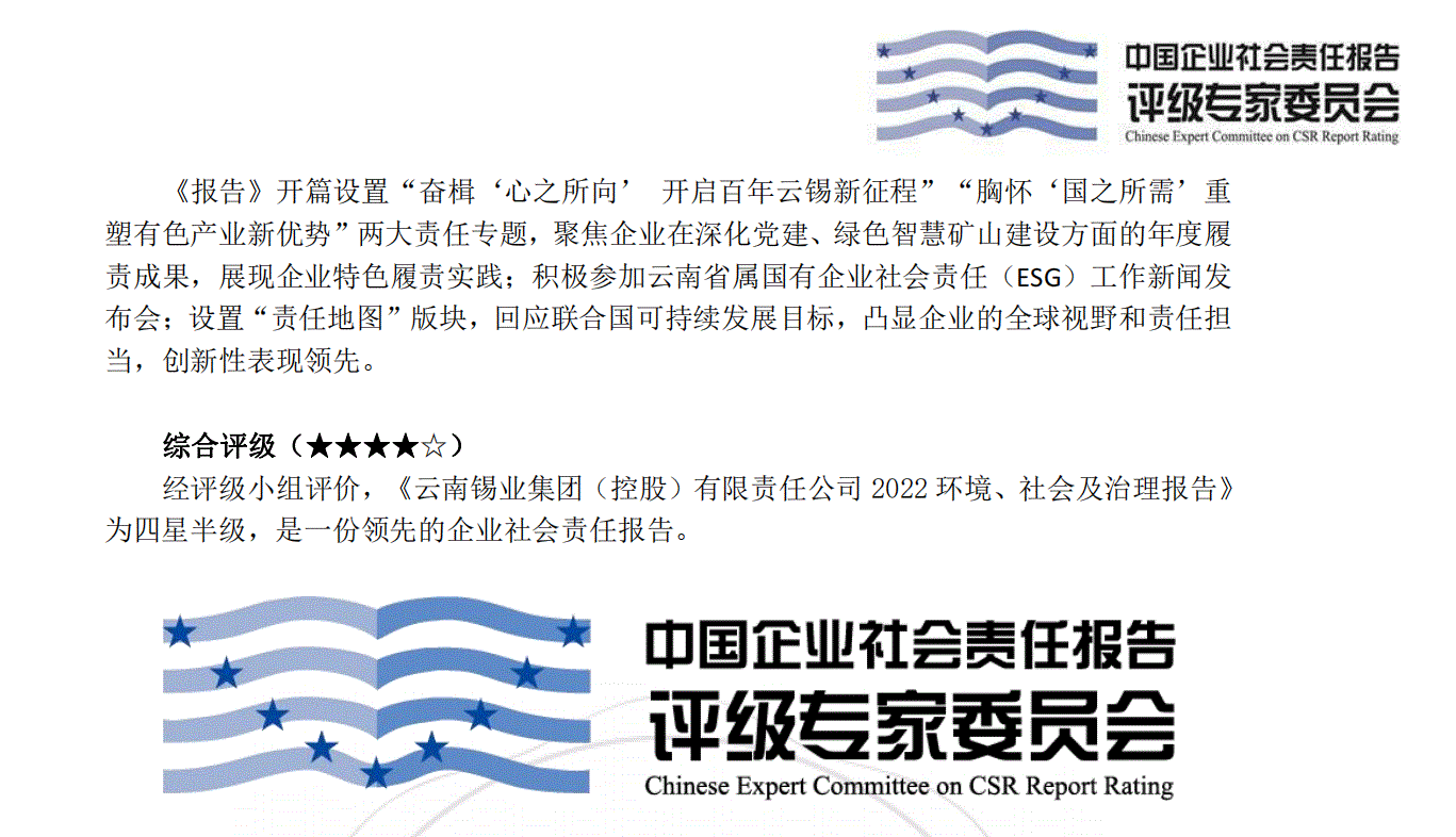 近日,中國企業(yè)社會(huì)責(zé)任報(bào)告評(píng)級(jí)專家委員會(huì)發(fā)布評(píng)級(jí)結(jié)果,《云南錫業(yè)集團(tuán)(控股) 有限責(zé)任公司2022環(huán)境、社會(huì)及治理報(bào)告》首次參評(píng)即獲“四星半級(jí)”,被綜合評(píng)定為“是一份領(lǐng)先的企業(yè)社會(huì)責(zé)任報(bào)告”。目前,云南省屬企業(yè)僅有2家獲得“四星半級(jí)”認(rèn)定,凸顯了云錫在公司治理、責(zé)任管理等方面的領(lǐng)先優(yōu)勢。