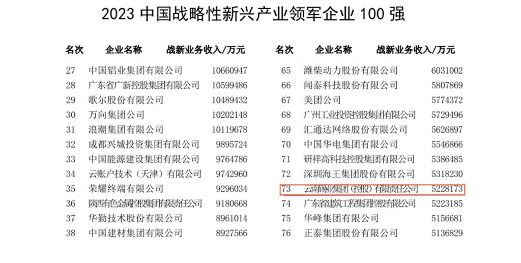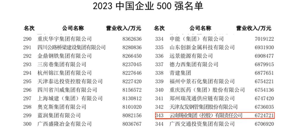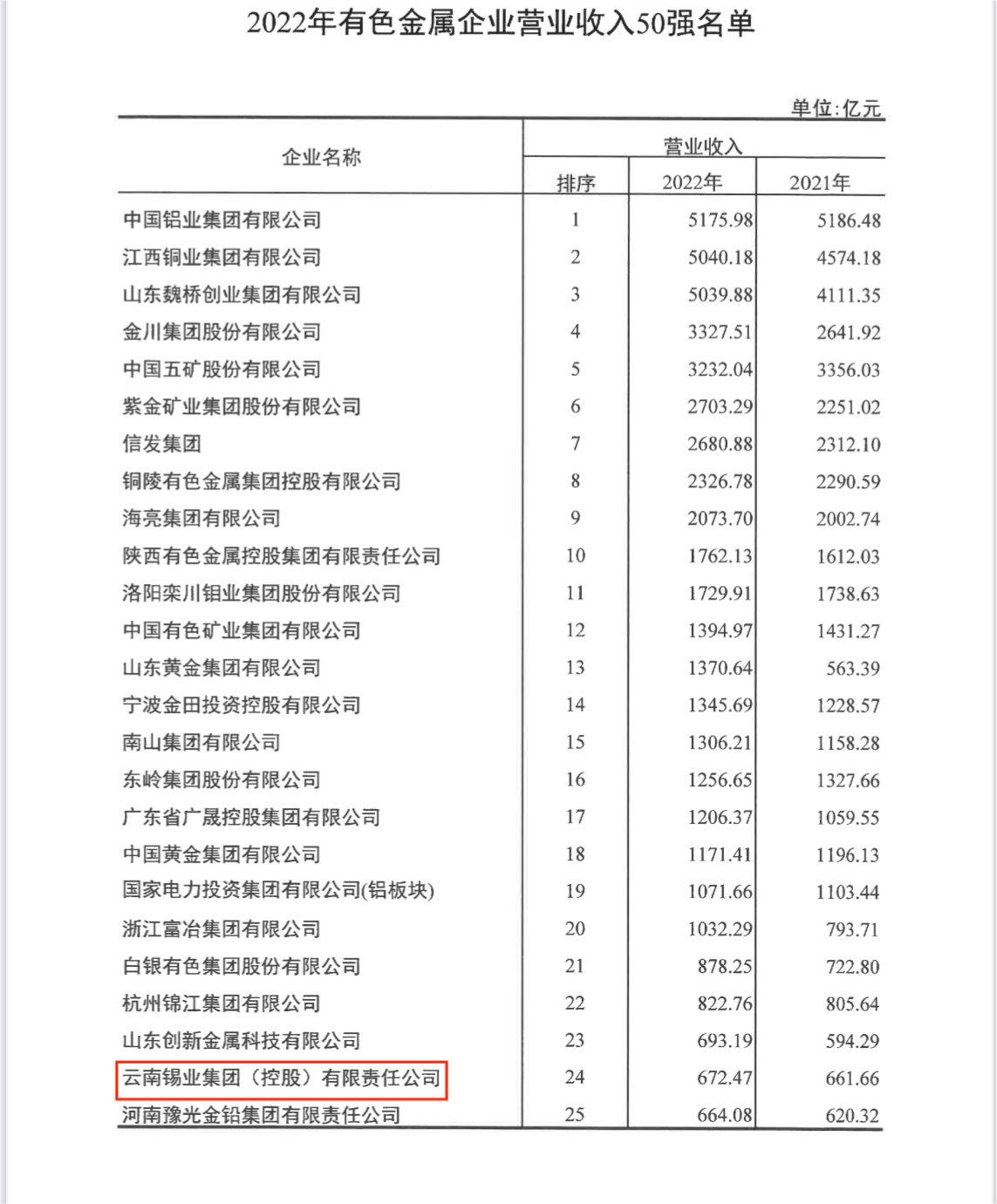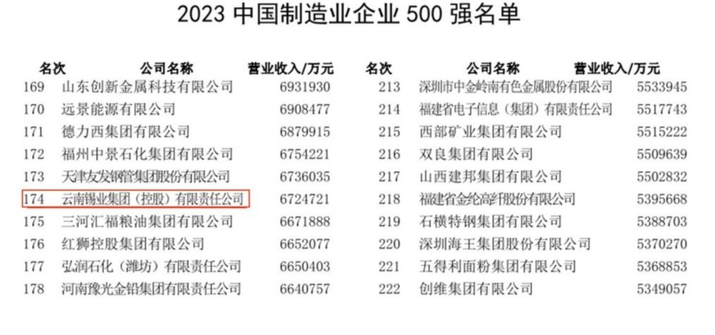 近日,中國企業(yè)聯(lián)合會(huì)、中國企業(yè)家協(xié)會(huì)聯(lián)合發(fā)布“2023中國企業(yè)500強(qiáng)”榜單。云錫位列2023年中國企業(yè)500強(qiáng)第343位,中國制造業(yè)企業(yè)500強(qiáng)第174位,中國戰(zhàn)略性新興產(chǎn)業(yè)領(lǐng)軍企業(yè)100強(qiáng)73位。在中國有色金屬工業(yè)協(xié)會(huì)發(fā)布的2022年有色金屬企業(yè)50強(qiáng)榜單中,云錫位列第24位。