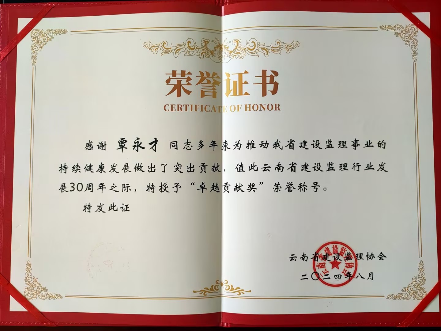 8月15日,云南省建設(shè)監(jiān)理協(xié)會(huì)召開(kāi)云南省促進(jìn)工程監(jiān)理行業(yè)高質(zhì)量發(fā)展暨工程監(jiān)理發(fā)展30年大會(huì),授予30人“卓越貢獻(xiàn)獎(jiǎng)”。錫都實(shí)業(yè)公司所屬云錫監(jiān)理公司覃永才獲此榮譽(yù)。