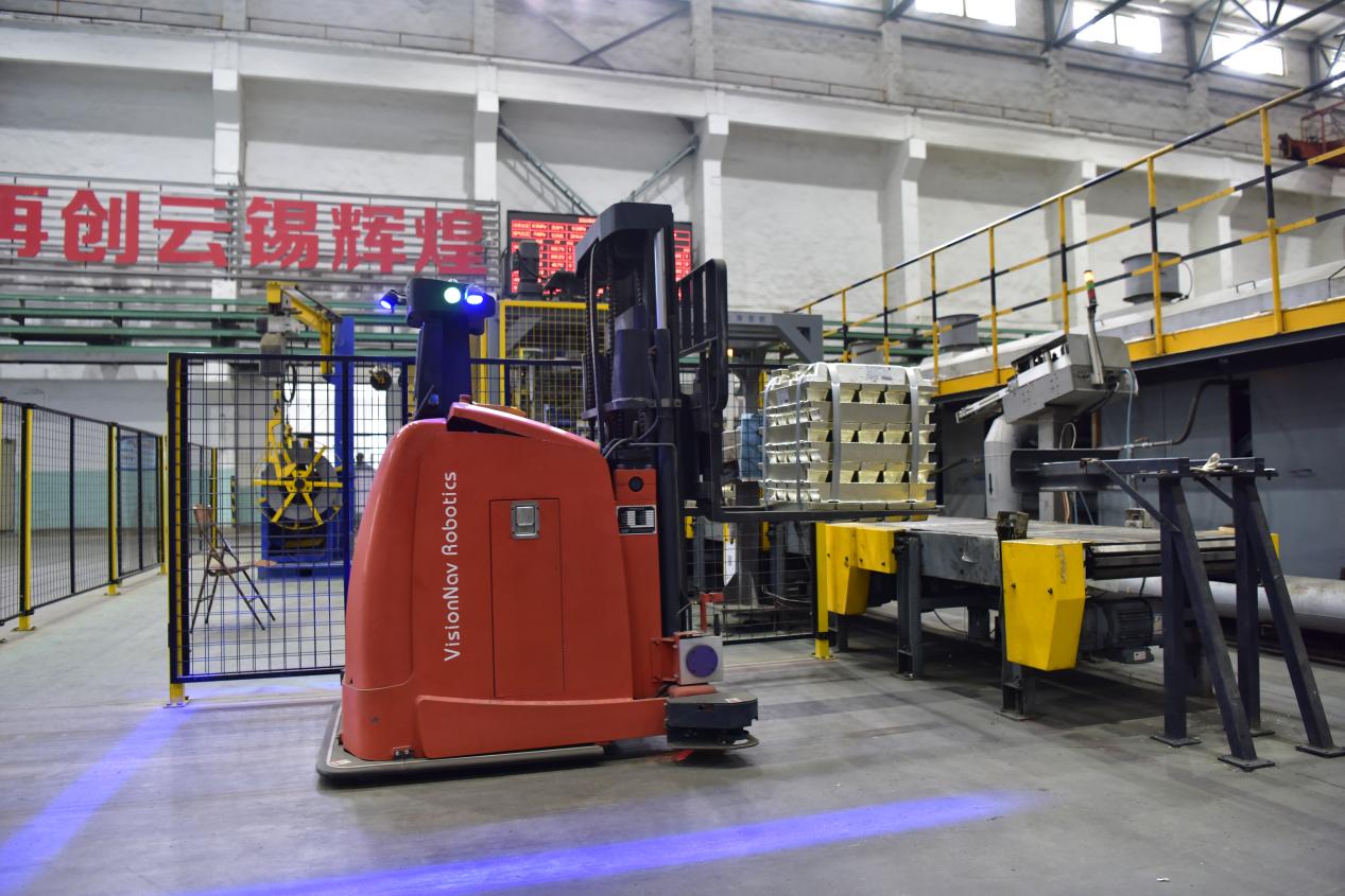 (錫業(yè)分公司5G智能倉儲(chǔ)配套設(shè)備——AGV運(yùn)送錫錠)