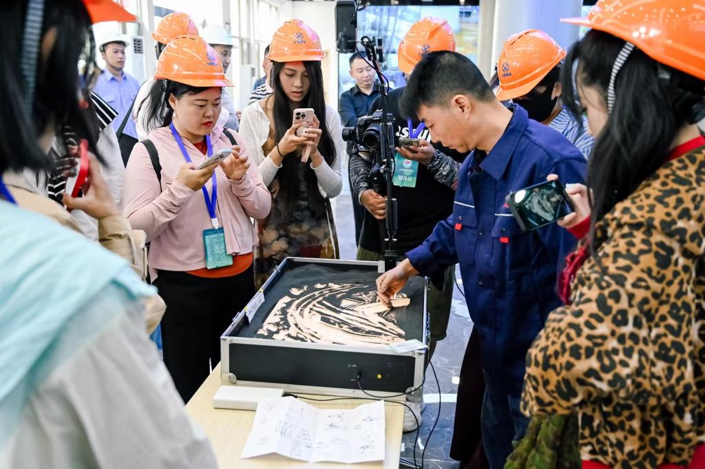 期間,錫業(yè)分公司在智慧運(yùn)營中心打卡點(diǎn)開展沙畫創(chuàng)作展示。云錫文聯(lián)沙畫作家在尺寸之間,如同放映機(jī)般,把錫冶煉廠貌、錫錠產(chǎn)品、直線澆鑄工業(yè)機(jī)械臂等代表性鏡頭揮沙成畫、栩栩如生,吸引眾多來賓打卡拍攝。