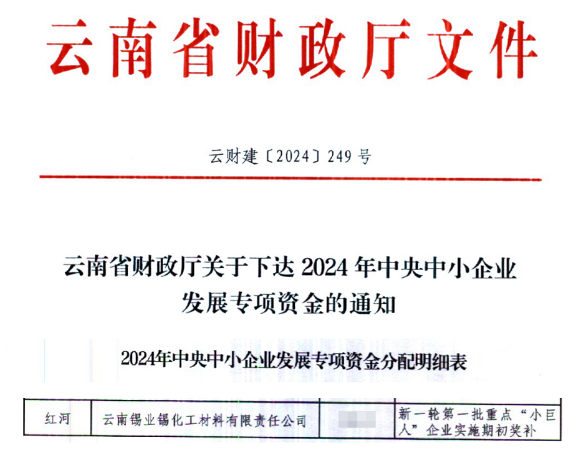 2024年,工業(yè)和信息化部聯(lián)合財政部開展新一輪第一批支持專精特新中小企業(yè)高質(zhì)量發(fā)展工作,擇優(yōu)遴選出一批重點“小巨人”企業(yè)予以支持。云南省9家企業(yè)入選,錫化工公司位列其中,成為云錫首家國家級專精特新重點“小巨人”企業(yè)。