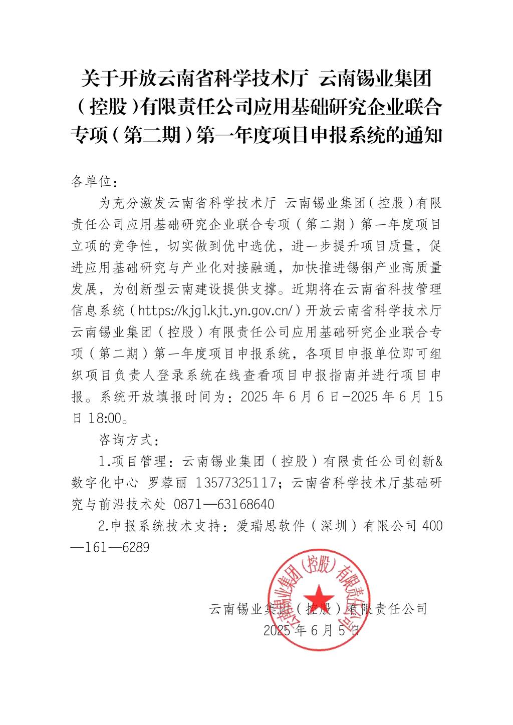 關(guān)于開放云南省科學(xué)技術(shù)廳 云南錫業(yè)集團(tuán)(控股)有限責(zé)任公司應(yīng)用基礎(chǔ)研究企業(yè)聯(lián)合專項(xiàng)(第二期)第一年度項(xiàng)目申報(bào)系統(tǒng)的通知